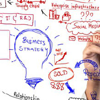 A hand draws business strategy concepts on a whiteboard, including a light bulb labeled “Business Strategy” and various diagrams, charts, and keywords like Social Media and Supply Chain in red and blue markers.